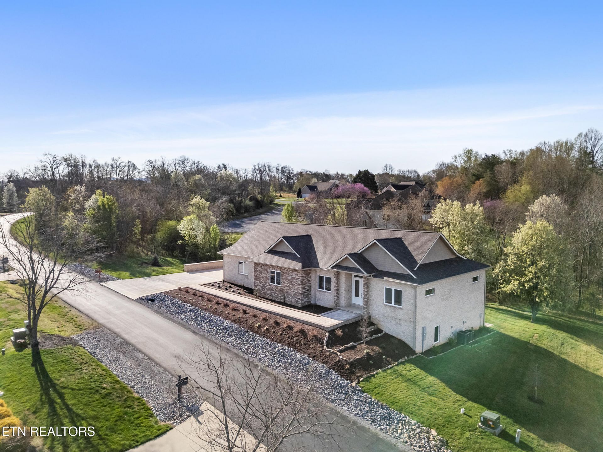 Beautiful brick and stone home with custom upgrades throughout, ideally situated on a .39-acre homesite in the Kahite neighborhood of Tellico Village. With brick and stone on the front and three additional brick sides, along with a professionally landscaped and sodded yard, this residence offers low-maintenance living and more time to enjoy the community's exceptional amenities.Step inside to a home defined by quality craftsmanship, including Acadia hardwood flooring, ceramic tile, 8-foot solid wood doors, deep baseboards, crown molding, tray ceilings, and thoughtfully designed custom closets by Carolina Closets. The spacious main living areas feature 10- to 12-foot ceilings and an open, inviting layout. Lower level features 9-foot ceilings.The kitchen is a standout with quartz countertops, a waterfall island, and a full suite of stainless KitchenAid appliances including range, oven, dishwasher, and microwave. Quartz counters extend into the laundry room and bathrooms for a cohesive, upscale finish. Multiple dining options include the island, eat-in kitchen, formal dining room, and alfresco dining on the private back deck.The extra-wide driveway leads to a landscaped front walkway and a paved, covered front porch. A decorative leaded-glass entry door with transom window welcomes natural light while maintaining interior privacy.The main level offers a formal dining room, a gracious living room open to the kitchen, and a separate sitting room featuring a gas fireplace with remote control and access to the back deck. The deck overlooks an oversized backyard and wooded common area, providing privacy and peaceful views. Constructed with composite decking and vertical coated metal railing, it is designed for durability and low maintenance.The owner's suite is privately located on the left side of the home, while bedrooms two and three are on the opposite side, each with its own bathroom. The owner's bath features a dual-sink vanity with center storage tower, private toilet area, extra-wide doorway, and a large zero-entry tiled shower with both rain and wall/wand showerheads.The lower level includes an additional full bathroom, a home office with a large window, and a versatile flex space with a wet bar, ideal for a coffee or wine bar, art studio, or additional entertaining area. Sliding doors provide access to a paved patio and the backyard.Additional features include:--Side-entry three-car garage with ample turnaround space--Level paver driveway, pathways, and front and rear patios--In-ground irrigation system--Exterior security lights and cameras--Two instant hot water heaters--Two separate HVAC units (one per level)--Fully encapsulated, conditioned crawl space with dehumidifier, suitable for storage--Additional storage beneath interior stairsLocated in Kahite, part of the Tellico Village golf and lake community, residents enjoy access to three golf courses, a recreation center, lake access, walking trails, pickleball and tennis courts, community pool, boat dock, and social gathering spaces including the Kahite Pub & Grill, community center, mountain-view pavilion, driving range, playground, and picnic pavilion. A wide variety of social clubs--from cars and motorcycles to poker, mahjong, book clubs, and crafting--make this an active and welcoming community.Mandatory Tellico Village POA fee: $181.53/month. Some of the photography shows virtual staging of furniture. This home has not been lived in. Buyers to verify square footage.